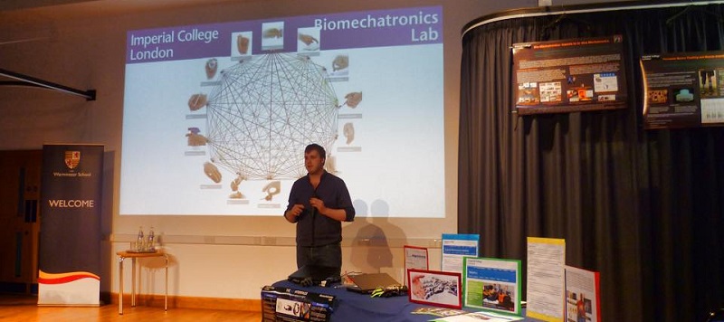 As part of the talk, Samuel gave a presentation on the latest developments in creating customised forms of prosthetic control, a vital aspect of BioMechatronic prosthetics.  As part of the lecture, Samuel answered questions during the breaks and demonstrated a robotic hand that responds to sound signals from the biceps and triceps muscles, allowing members of the audience to try it out.