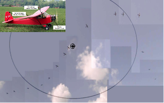 Actual flight test of insect-inspired orientation reflex. Trace shows aircraft moving into alarm radius, striking virtual target, holding heading until exiting alarm radius, and resuming original flight path with ¼ Scale Piper Cub Test Platform (top left)